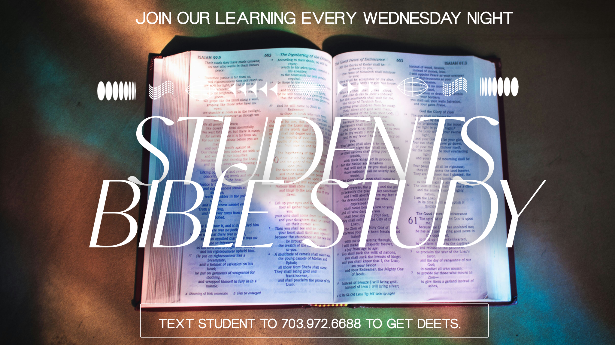 Join us every Wednesday at 6:30pm for Students Bible Study. Text STUDENT to 703.972.6688 for more information!