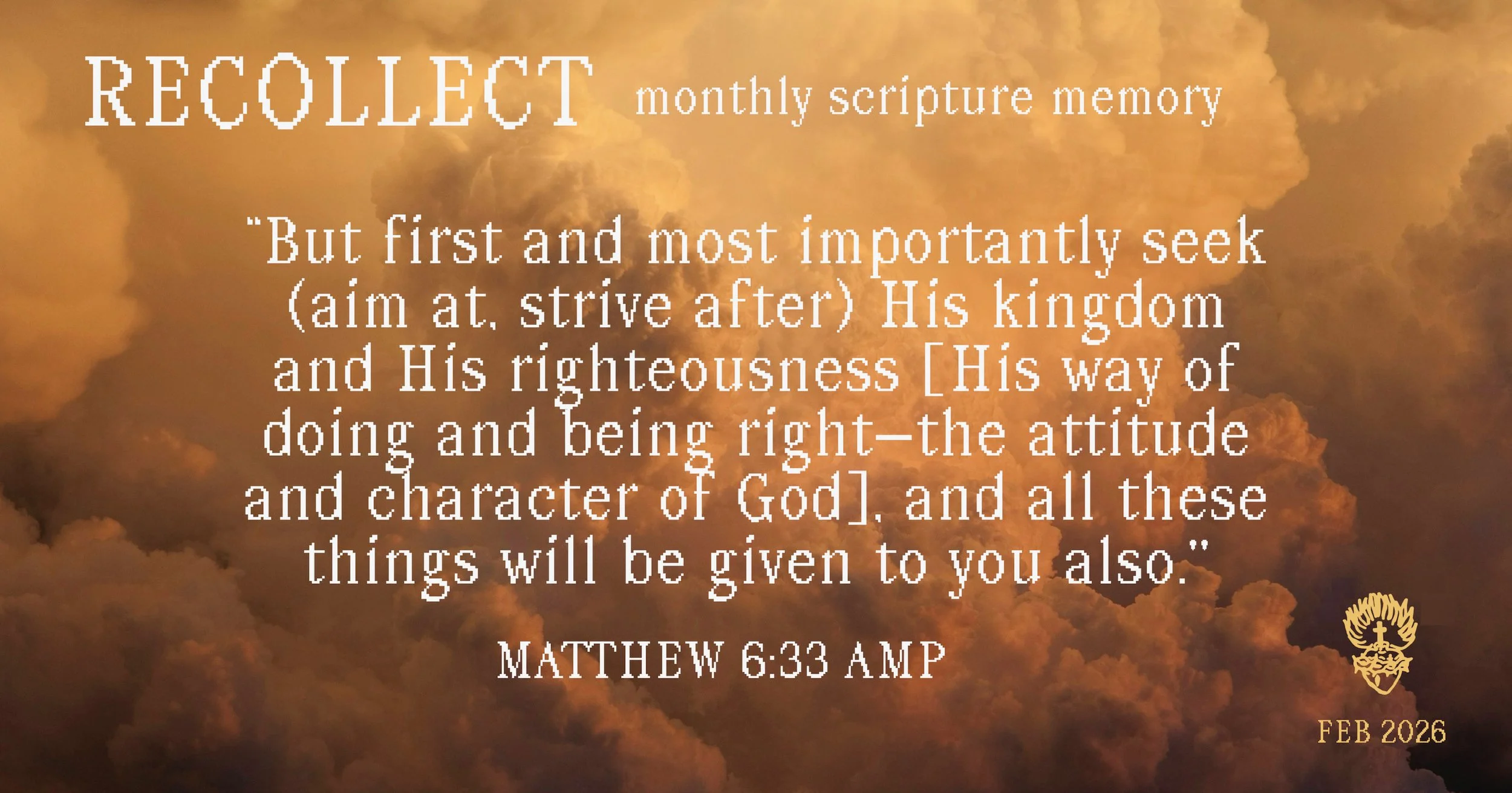 Memorize one verse each month with us, building a store of Scripture to call on when it matters most. This month, we are memorizing Matthew 6:33 AMP. Text RECOLLECT to 703.972.6688 to get the verse monthly!