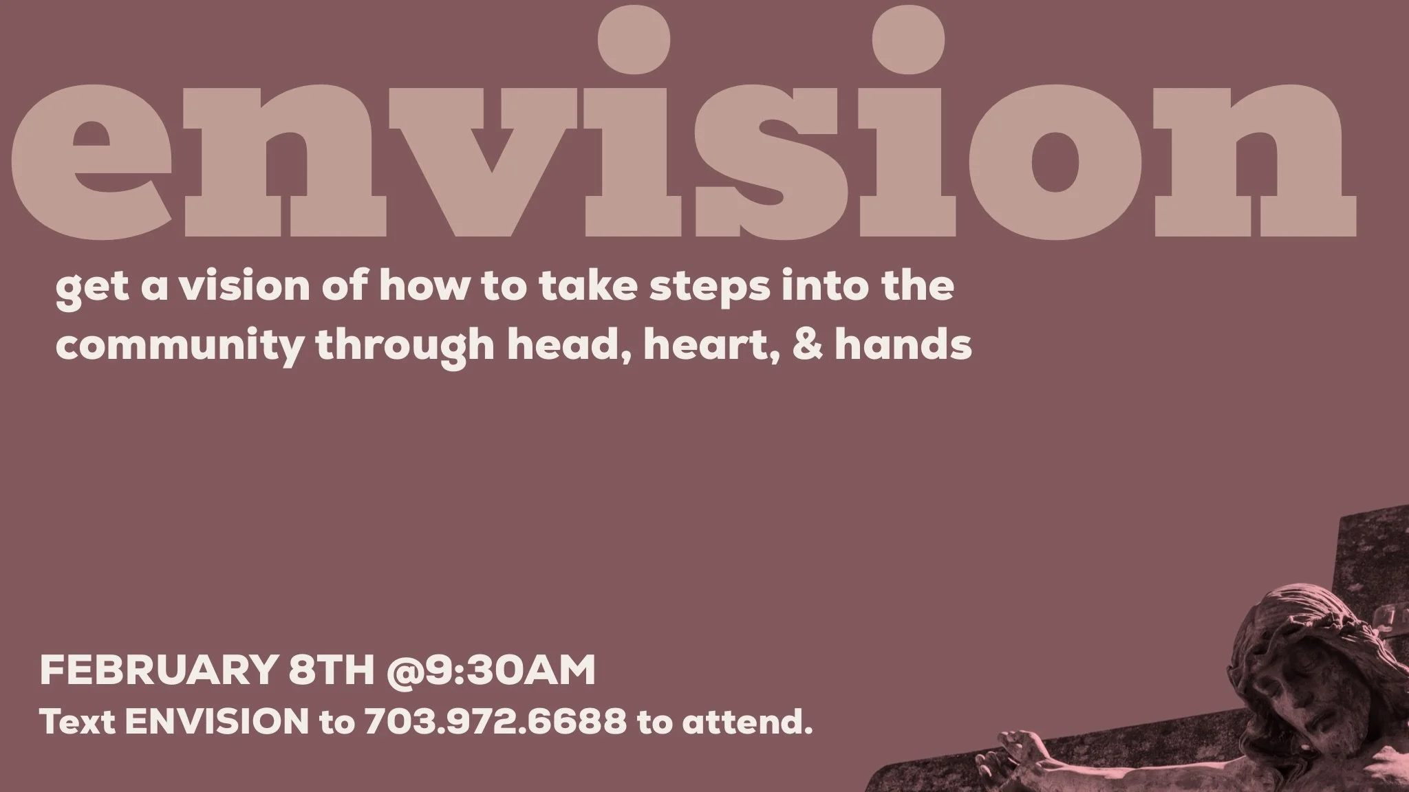 Have you attended You Belong Here and are looking to take the next step in our community? Envision is for you! Envision is a one-time class designed to help you get a a fuller picture of who we are and how we live as a church community. Join us on February 8th at 9:30am to explore four key aspects of our church! Text ENVISION to 703.972.6688 to attend.